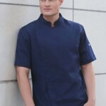 50% poliestere, 50% cotone. 150 g/m². Giacca di classe da cuoco con abbottonatura nascosta, tessuto leggero. Maniche corte, sciancrata, bottoni a pressione, pratico passante sul retro del colletto per tenere fermo il grembiule , tasca sulla manica sinistra con portapenne, idonea a lavaggi industriali. Candeggio consentito.Informazioni prodotto