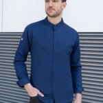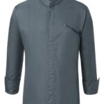 50% poliestere, 50% cotone. 150 g/m². Giacca da cuoco moderno con colletto alto elegante e abbottonatura nascosta, bottoni a pressione, taschino elegante sul petto, manica sinistra con pratica tasca a filetto, polsini con spacchetti laterali. Idonea a lavaggi industriali. Candeggio consentito.